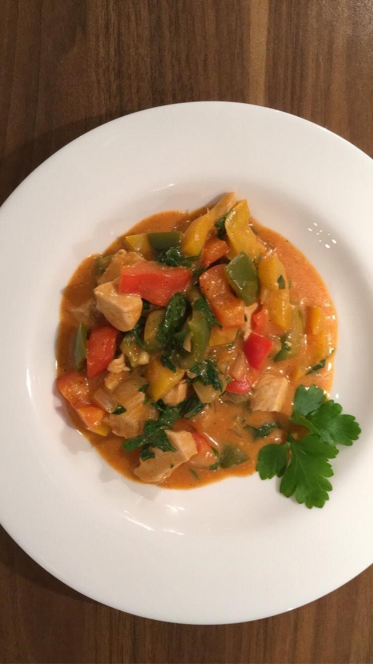 300g chicken breast, 2 onions, 1 clove of garlic, 450g pepper of different colours, 2 tbsp olive oil, 1 tsp paprika powder, 1 tsp tomato paste, 1 tsp flour, 300ml broth, 1/2 bunch of parsley, 1 tbsp crème fraîche, salt & pepper