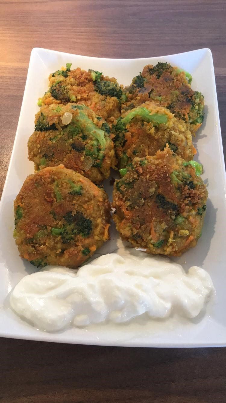 150g broccoli, 50g carrots, 1/2 onion, 1 clove of garlic, 200g canned chickpeas, 1 tsp curry powder, 35g breadcrumbs, olive oil, salt & pepper