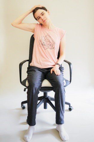 Neige den Kopf langsam zu einer Seite. Du kannst leicht mit der Hand den Kopf weiterdehnen, ansonsten lege die Hände auf die Oberschenkel oder Stuhlkante.