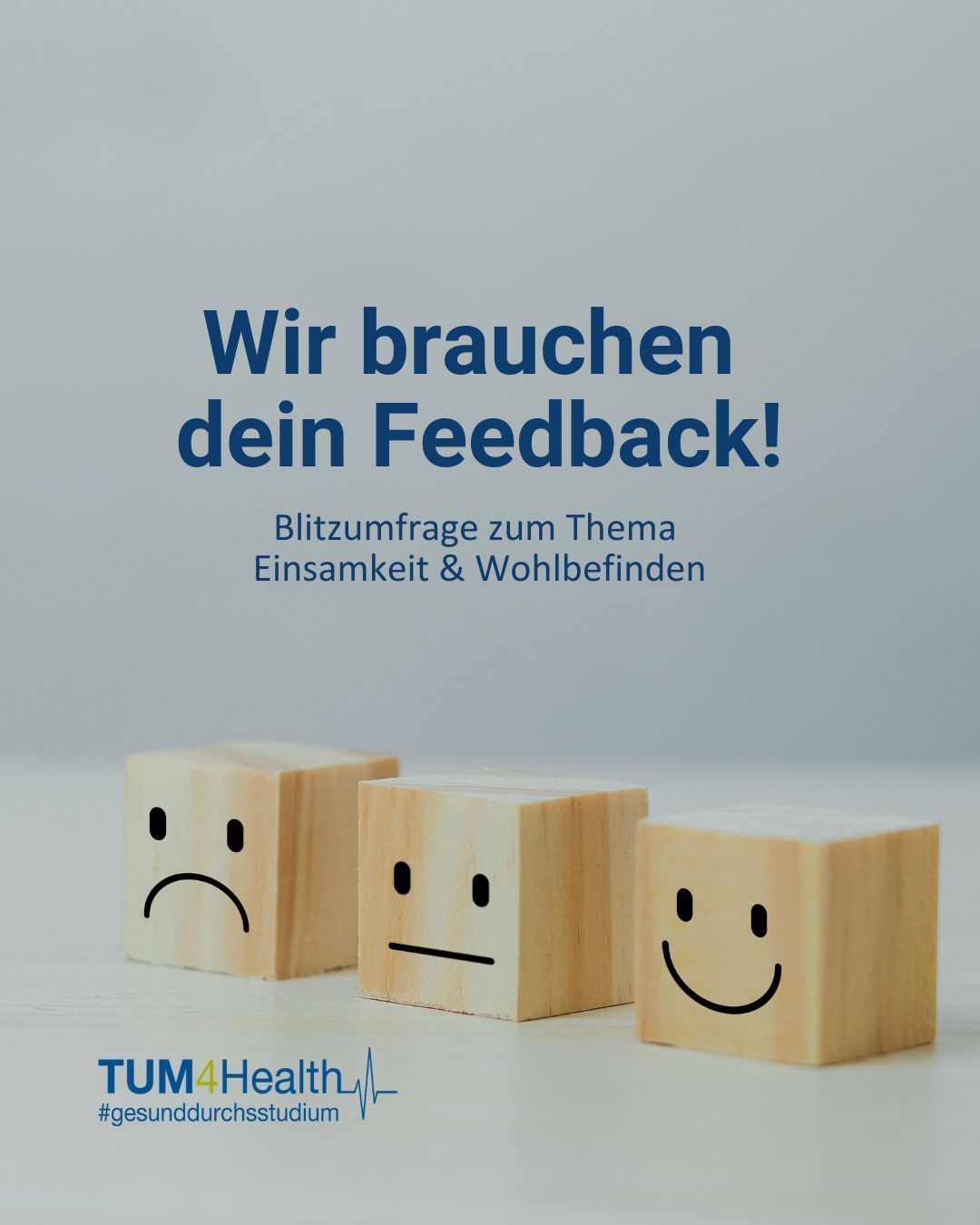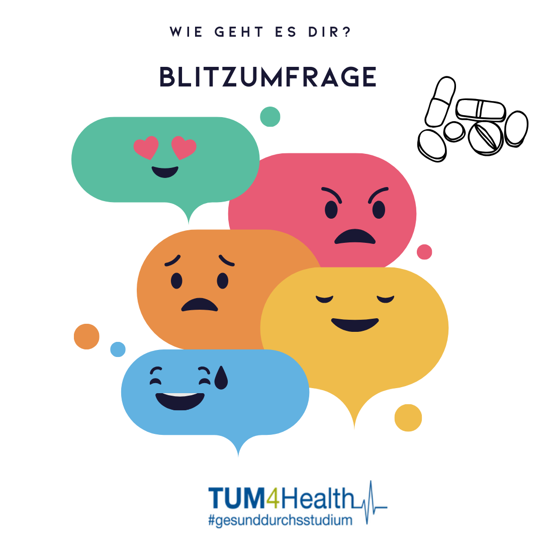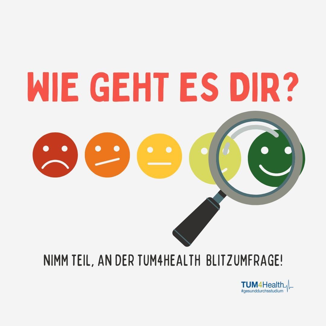 Um die TUM4Health Angebote stetig weiterzuentwickeln und um auf die Bedürfnisse der TUM Studierenden eingehen zu können, möchten wir erfahren, wie es dir aktuell geht! In unserer aktuellen Blitzumfrage interessiert uns neben deinem Wohlbefinden auch, wie viel Zeit du im Internet verbringst und welche Medien du nutzt. Außerdem findest du Fragen zu deine Schlafverhalten und deinem Chronotypen in unserem kurzen Survey. Mach mit und unterstütze uns! Danke - Dein TUM4Health Team