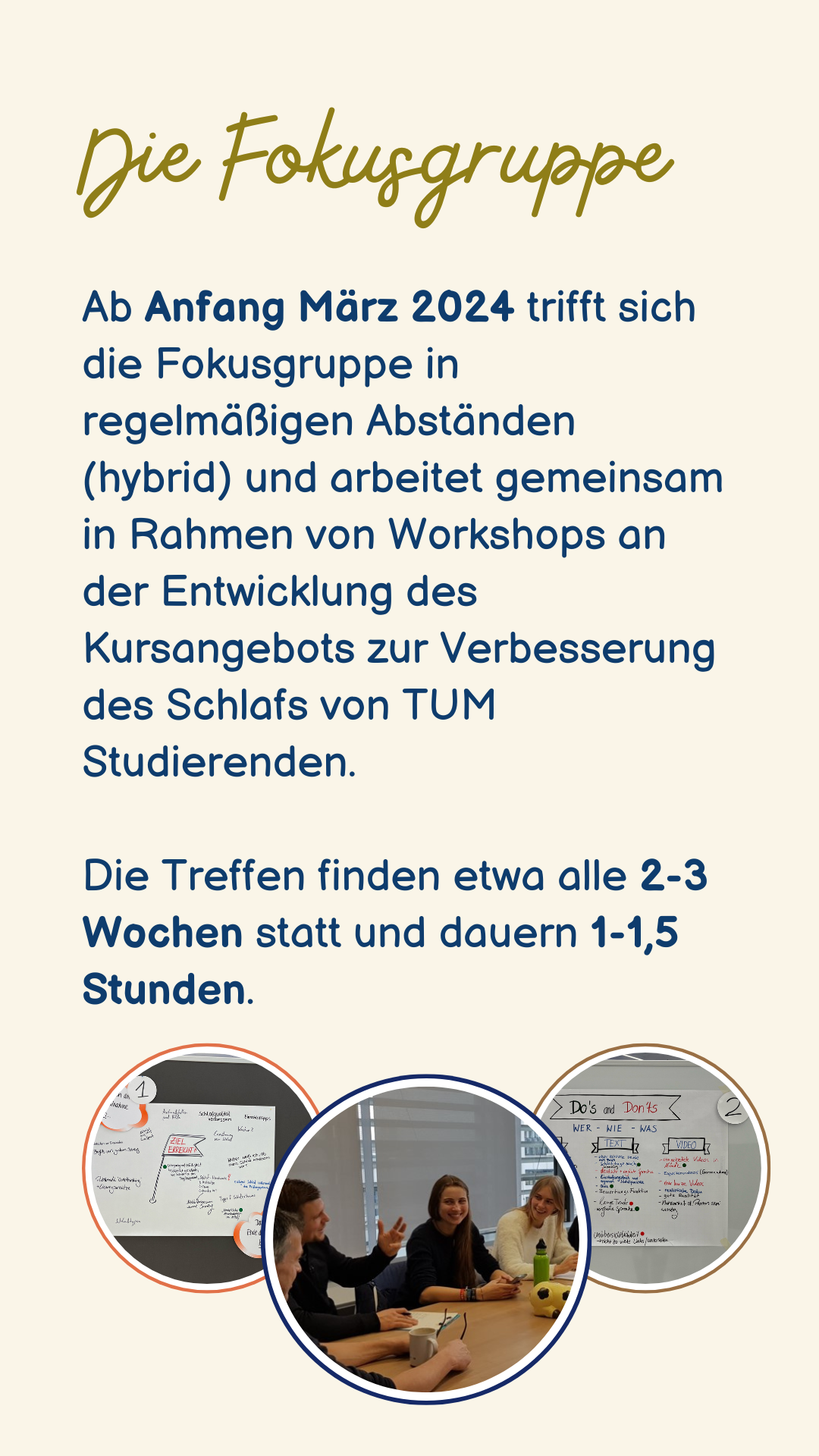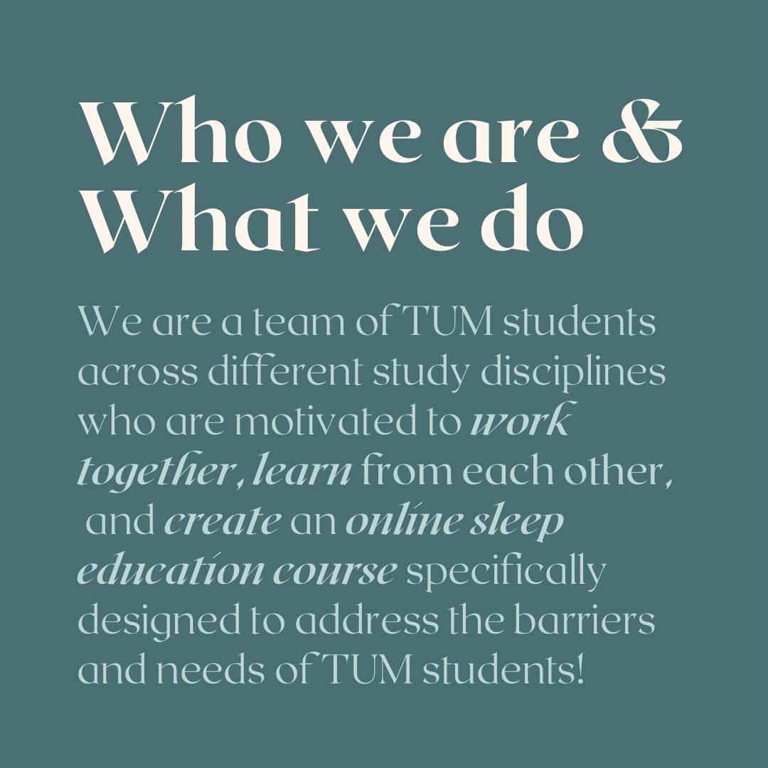 Das Dreamteam ist eine Arbeitsgruppe mit Studierenden verschiedenere TUM Schools, die zusammen an der Entwicklung eines Online Sleep Education Kurses arbeit, der spezifisch auf die Bedarfe und Bedürfniss der TUM Studierenden eingeht. Jedes Teammitglied bringt eigene Ideen und Kompetenzen ein, um dieses Vorhaben weiter voranzutreiben.