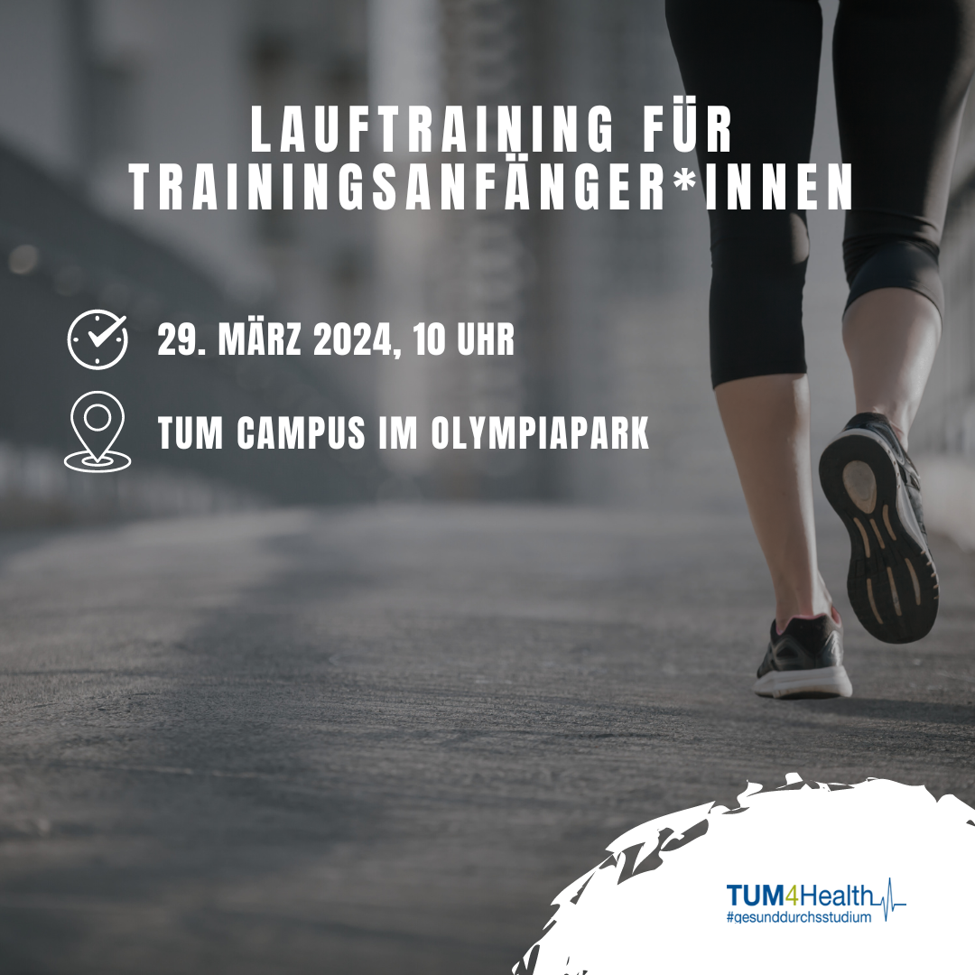 Wir bieten an diesem Tag ein Training explizit für Laufanfänger*innen an und orientieren uns dabei am TUM4Health-Laufprogramm. Mindestens ein/e Trainer*in wird mit euch zusammen ein Warm-Up machen und dann in moderaten Tempo und mit entsprechenden Gehpausen ein - an eure Bedürfnisse angepasstes - Lauftraining absolvieren. Uns geht es dabei darum, dass ihr mit Selbstvertrauen in den Campuslauf starten und etwaige Fragen zum Training stellen könnt.