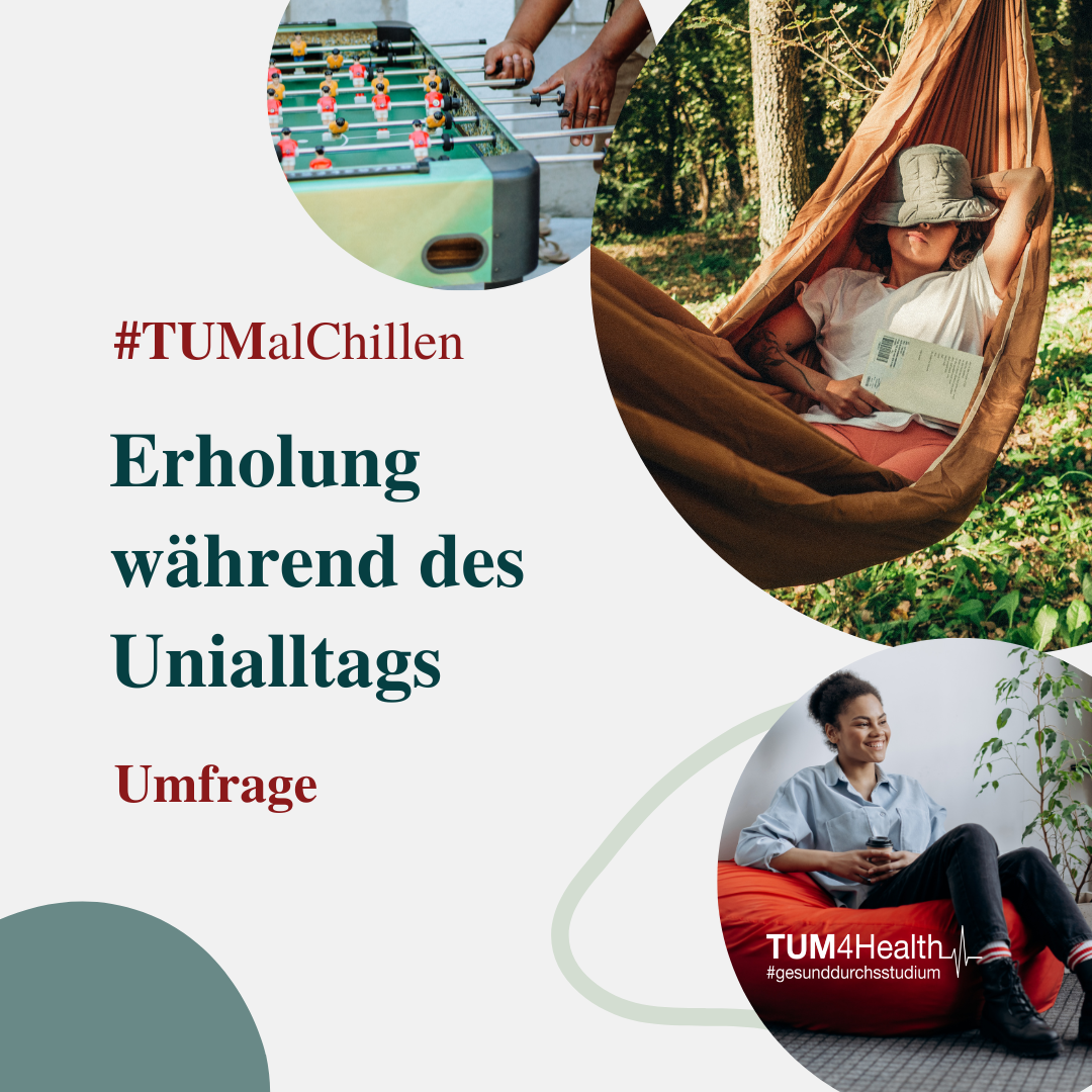 Oft sind die Tage an der Uni lang, man hetzt von einer Veranstaltung zur nächsten und es bleibt nur kurz Zeit für eine Pause. Wir möchten wissen, wo Du Dich im Unialltag erholst und Dir eine kurze Auszeit vom stressigen Alltag nimmst! Zeig uns Deinen Lieblingserholungsort am TUM Campus und mach mit beim TUM4Health Fotowettbewerb! Alle weiteren Informationen findest Du auf unserer Homepage.