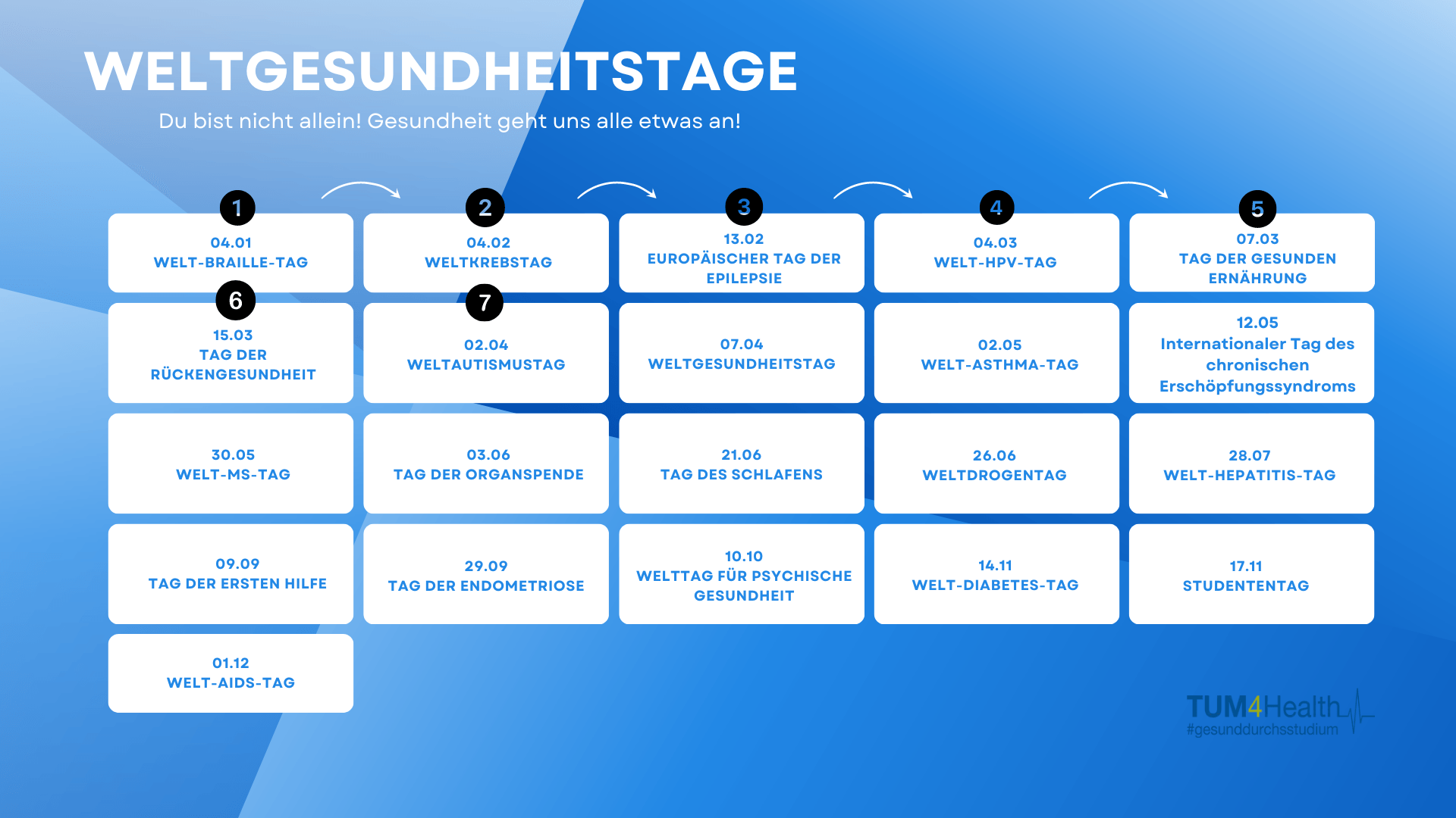 Studierenden der Fakultät für Sport- und Gesundheitswissenschaften stellen im Rahmen ihres Projekts einige bekannten und weniger bekannte Gesundheitstage vor und erklären die Hintergründe zur Entstehung des Tages und stellen Wissenswertes zum jeweiligen Gesundheitsthema vor. Stories und weiterführende Links werden parallel auch über den TUM4Health Instagram Account veröffentlich.