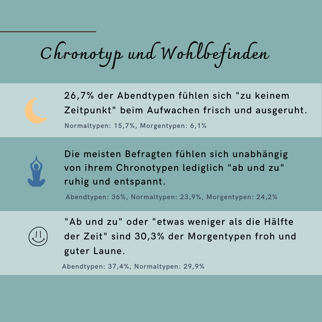 Im Rahmen der Blitzumfrage wurde der Chronotyp mit dem reduced Morningness-Eveningness Questionnaire (rMEQ) mit 5 Items erfasst. Der Großteil der Studierenden konnten dem "Normaltypen" zugeordnet werden. Im Vergleich zu den Morgentypen, fühlten sich Abendtypen morgens weniger ausgeruht und berichteten, weniger gut gelaunt zu sein. Außerdem berichteten Abendtypen die kürzeste Schlafdauer aber auch die längste Internetnutzungsdauer. Dies wurde ebenso in früheren Studien gefunden und deutet darauf hin, dass diese Personengruppe unter dem sog. "sozialen Jetlag" leidet, der sich negativ auf diverse Gesundheitsverhalten auswirken kann. Mehr zum Thema "Chronotyp" und zum sozialen Jetlag erfährst du hier.