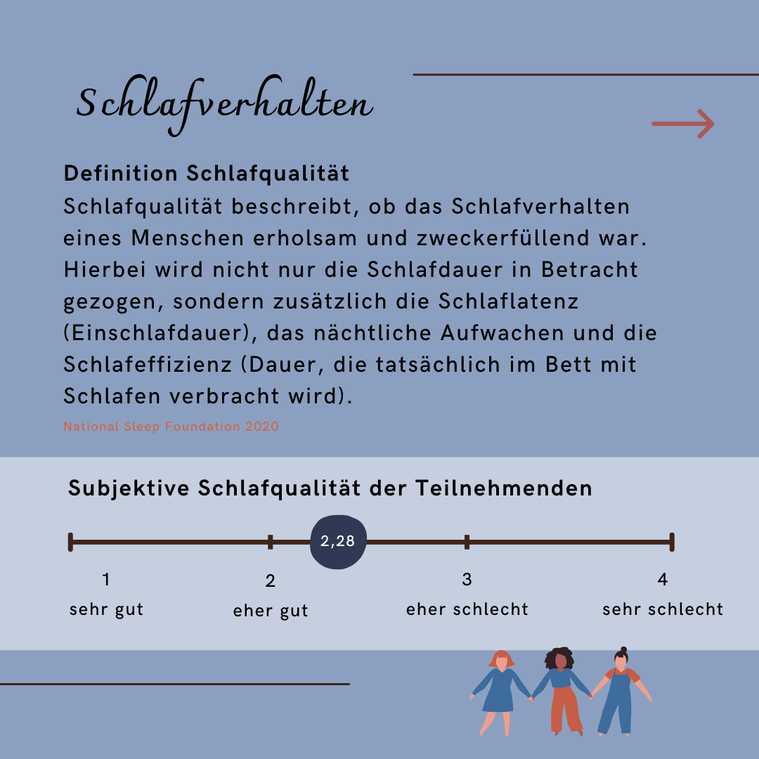 Die Teilnehmenden in der Blitzumfrage gaben rückblickend auf die letzten 4 Wochen an, im Schnitt 7,0 Stunden pro Nacht zu Schlafen und bezeichneten ihre Schlafqualität als "eher gut". Dabei berichteten männliche Studierende eine kürzere (subjektive) Schlafdauer und eine tendenziell schlechtere Schlafqualität als weibliche Studierende.