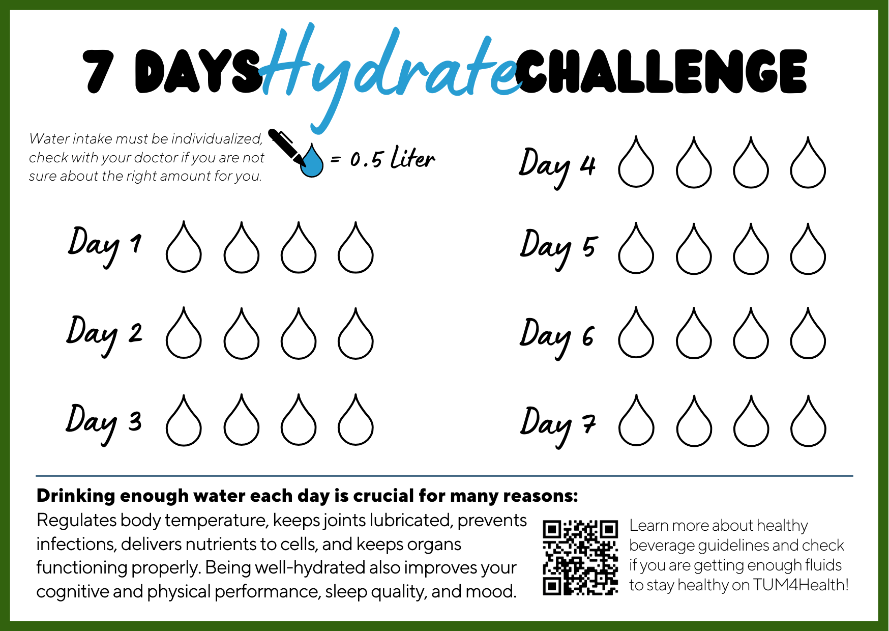 Brushing your teeth, staying away from the candy aisle in the supermarket, and taking the stairs instead of the elevator to the 6th floor today: In our everyday lives, we have already internalized numerous health behaviors or are kindly guided by our inner conscience to make a health-conscious decision (well, the stairs then!). However, sometimes (perhaps daily) we need to be reminded visually or by a verbal cue of what is good for us and our health. The TUM4Health "Pocketwissen" inclused two postcards that will help you to stay hydrated throught your day, and develop a healthy sleep routine! In addition, our emergency postcard summarizes all numbers you need to know as a TUM student.
