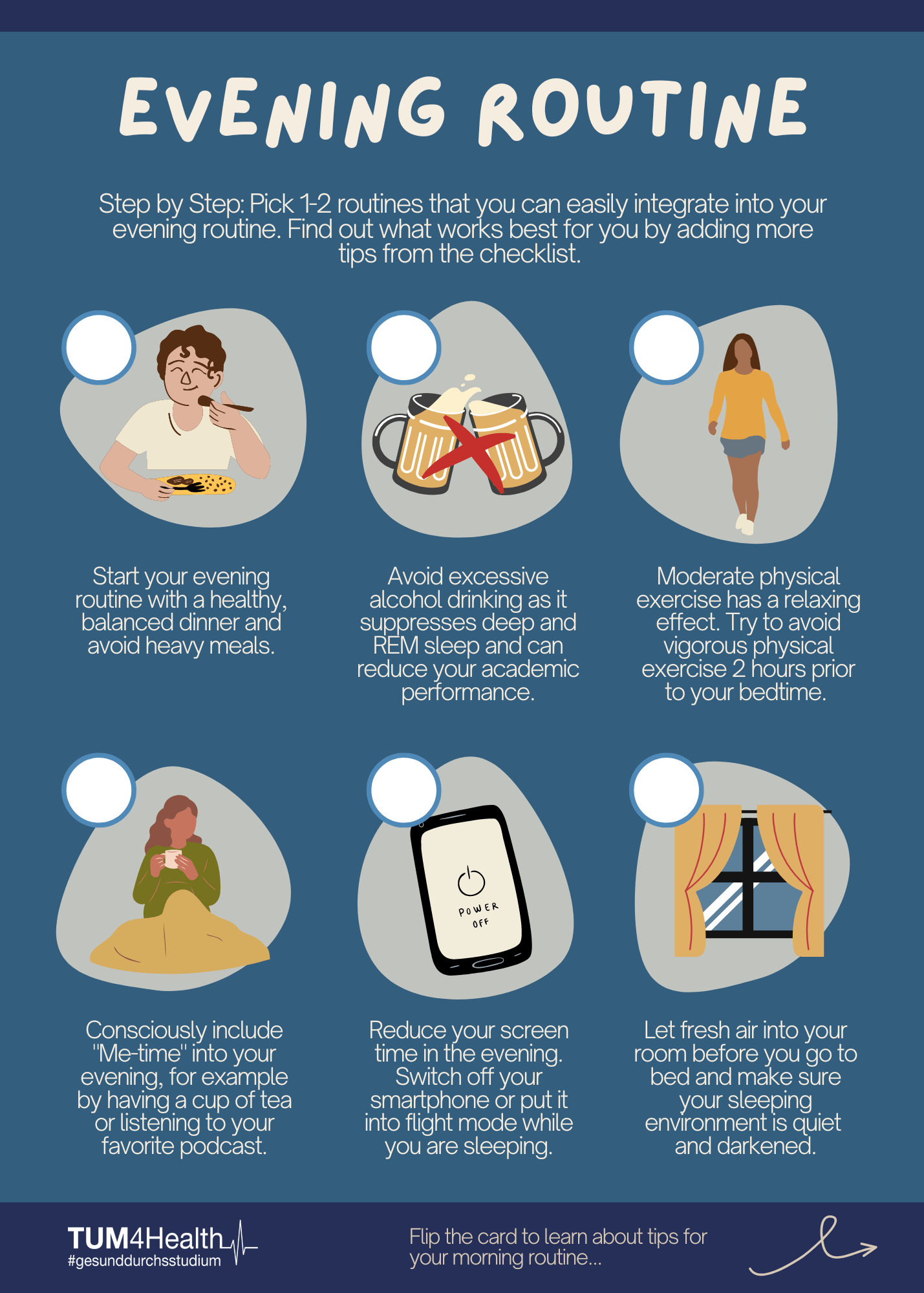 Especially at the beginning of the semester, students have to adapt to a new daily routine and balance many things at the same time: their study workload, a part-time job, social obligations, sports and leisure activities. While sleep is often not a priority, irregular sleep rhythms are common in students. Yet, sleep is an important predictor of cognitive performance in students and vital to our overall health. To keep a regular sleep rhythm during the semester, we've put together a checklist of tips that can help you to develop a healthy morning and evening routine and improve your sleep!