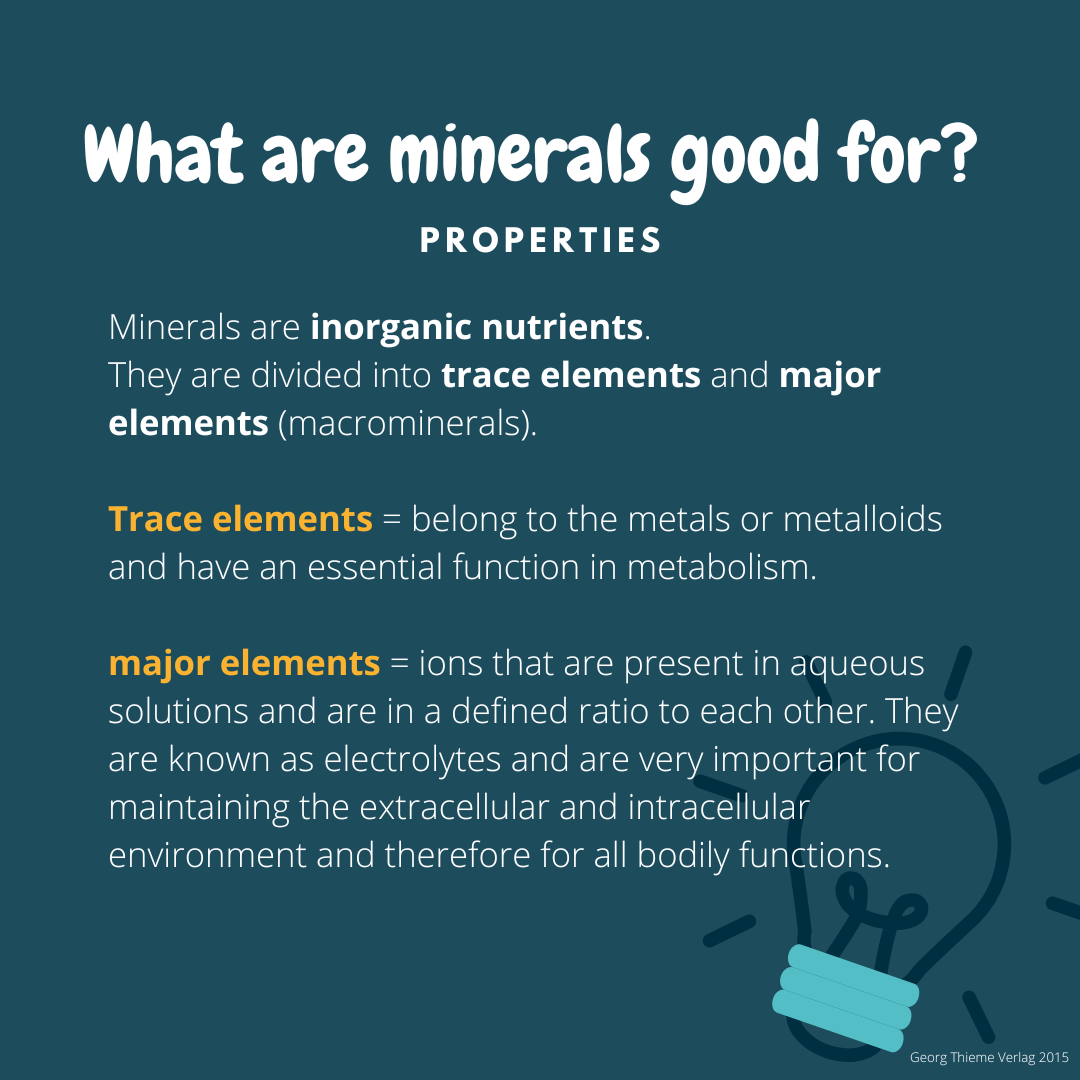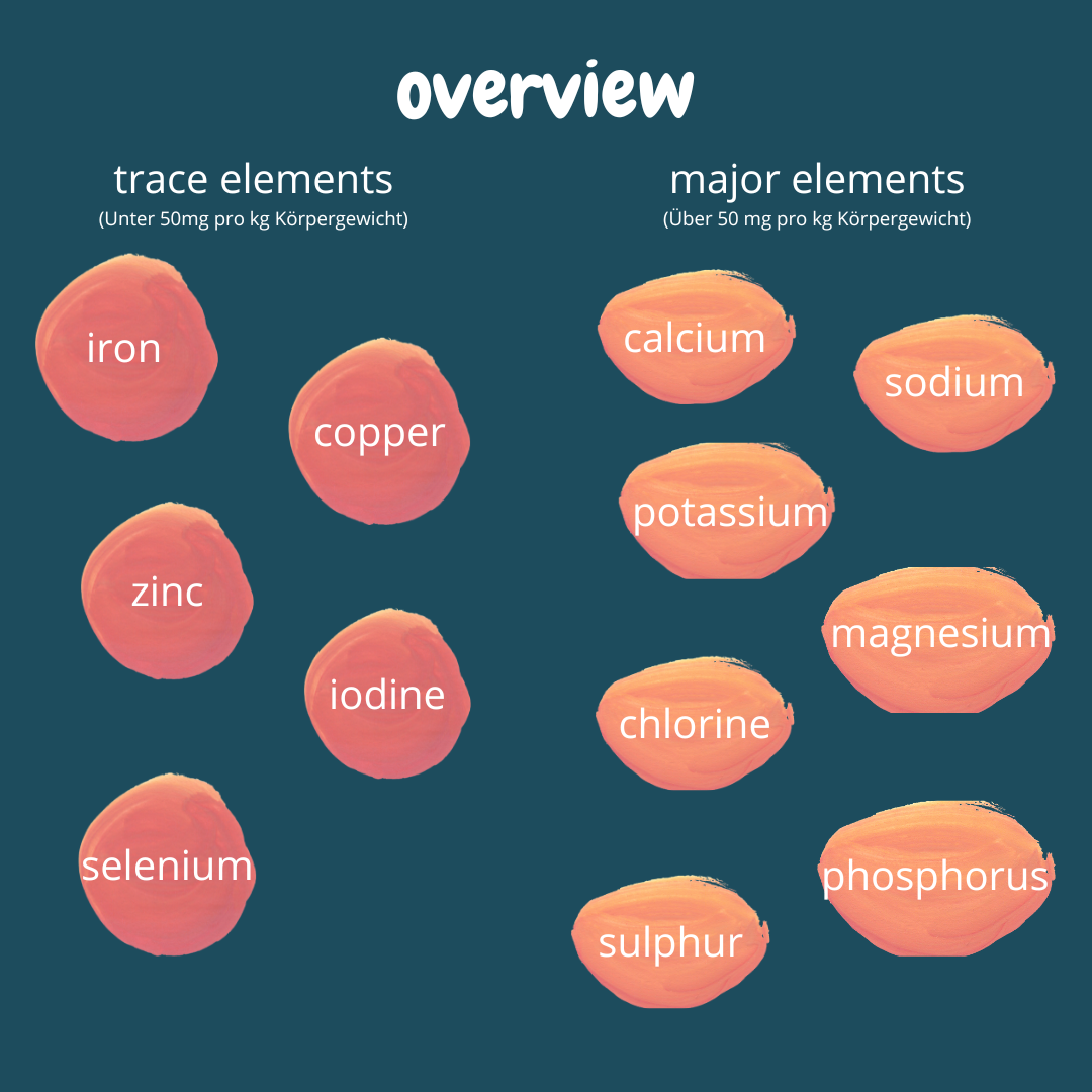 A distinction is made between trace elements and bulk elements. As the name suggests, trace elements are only present in the body in very small amounts, namely less than 50 mg per kg of body weight. Bulk elements, on the other hand, contain more than 50 mg per kg of body weight in the body.