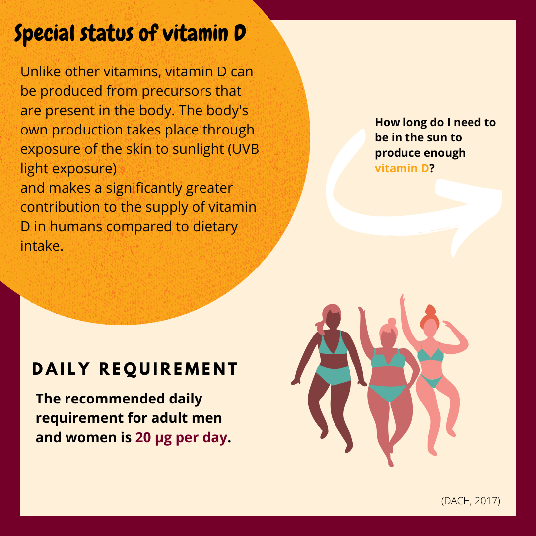 Vitamin D is often referred to as the "sun vitamin". Because of the UV exposure of the skin, our body is able to produce vitamin D itself.