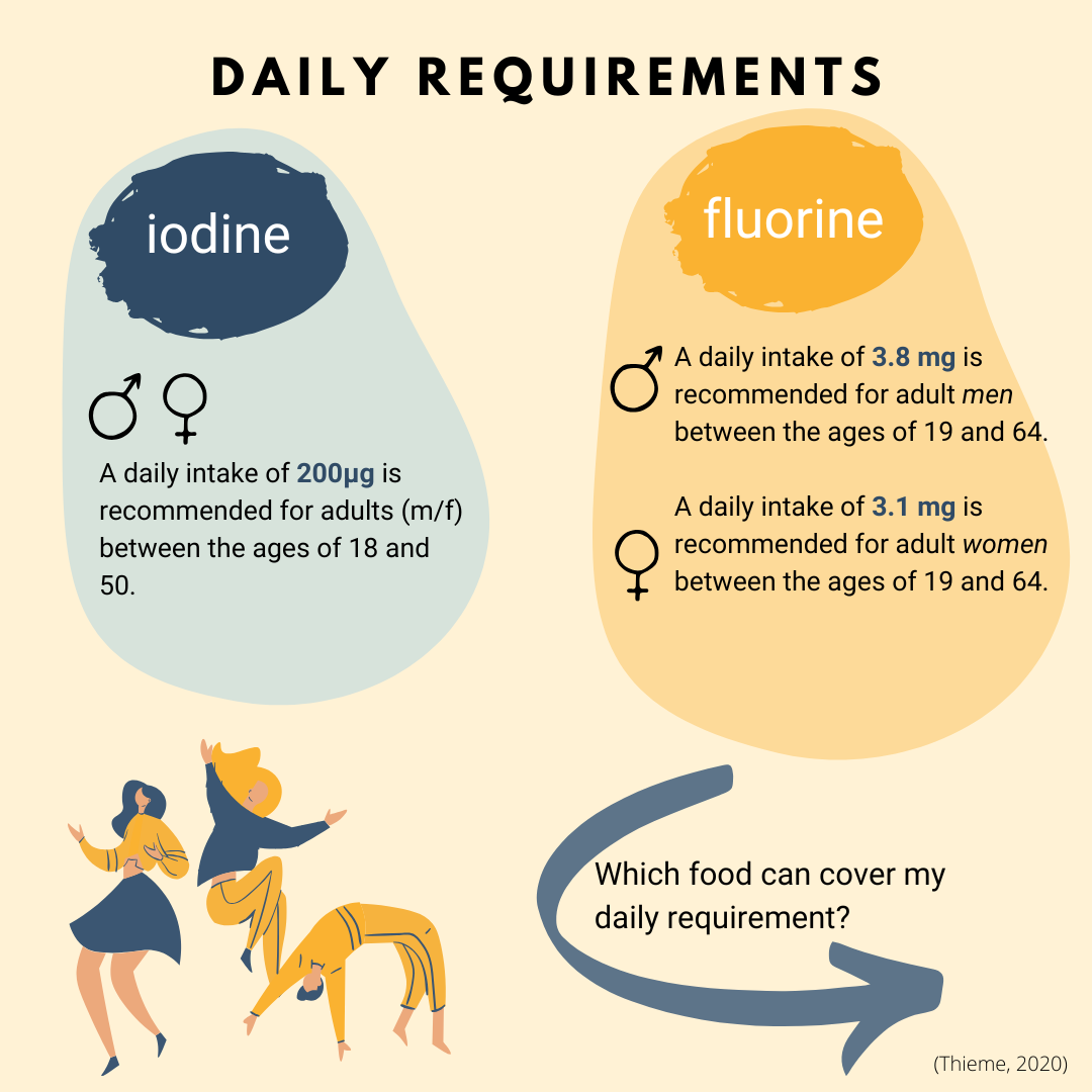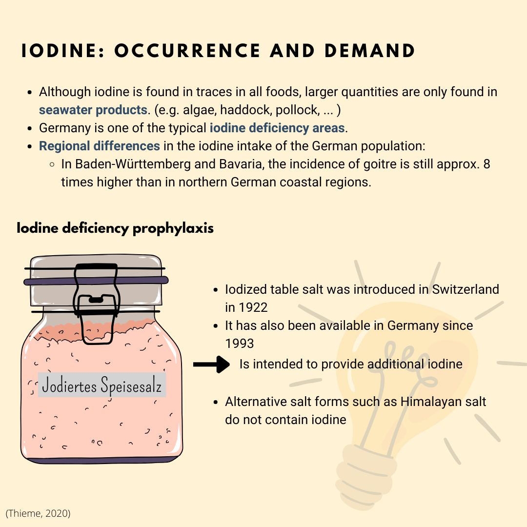 is one of the trace elements and serves, among other things, as a raw material for the production of our thyroid hormones. Since Germany is one of the regions in Europe with the lowest levels of iodine, measures have been taken to counteract deficiency diseases such as goiter.
